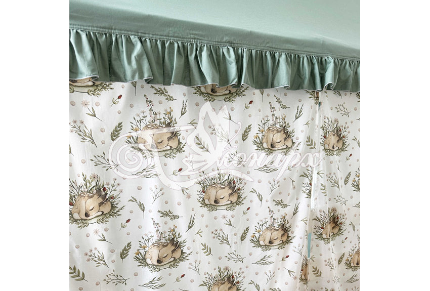 ширина - 137 см + 24 см на рюши (по 12 см на одну сторону). - Занавески с завязками (по 4 завязки на каждой занавеске) на переднюю сторону кроватки 2 шт.: